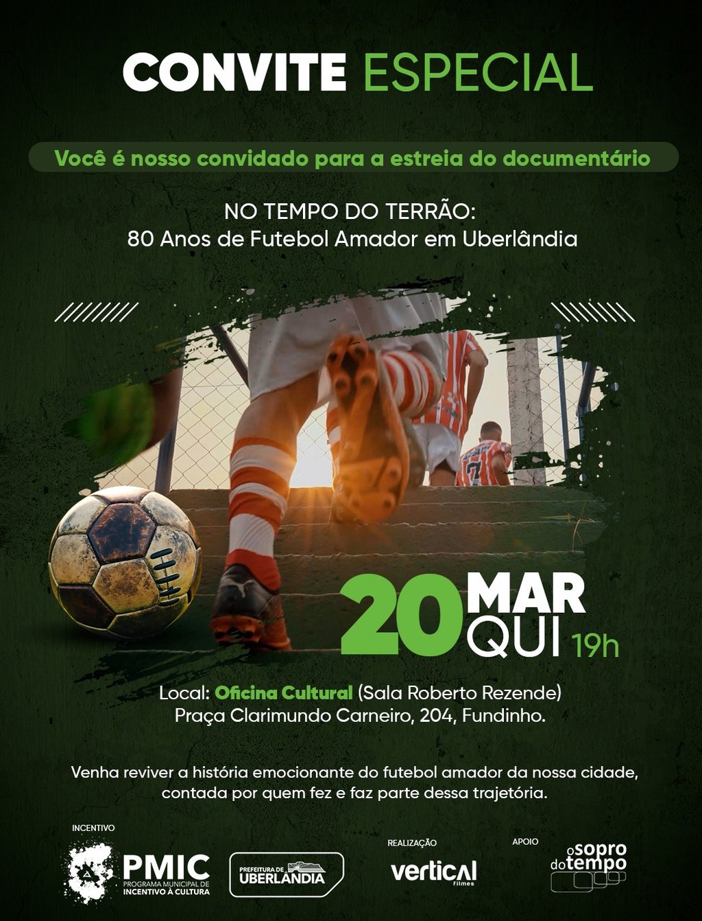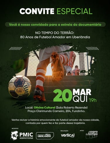 Realizado com sensibilidade e escuta atenta aos depoimentos e aos arquivos, o trabalho de montagem e construção de roteiro do filme No tempo do terrão foi um processo imersivo, orientado por uma busca constante de equilíbrio entre a memória e o presente, o gesto e a voz. Com 55 minutos de duração, o documentário, dirigido pelo cineasta Cris Barbora, pelo antropólogo Marco Paraná e pelo publicitário Alderico Lucas, percorre o vasto universo do futebol amador em Uberlândia, explorando as múltiplas formas como essa prática se conecta á cidade.